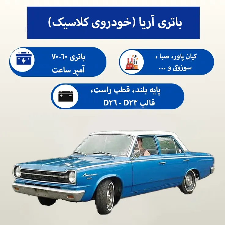 باتری فابریک ۶۰ آمپر D23 برای خودرو آریا کلاسیک گزینه استاندارد و مطمئنی است، اما اگر به ظرفیت بیشتری نیاز دارید، باتری ۷۰ آمپر D26 جایگزین عالی خواهد بود. هر دو گزینه با ولتاژ ۱۲ ولت و چینش قطب راست پایه بلند، عملکرد بهینهای ارائه میدهند. در سایت ایران باتری، میتوانید این باتریها را با قیمت رقابتی، گارانتی معتبر و خدمات ارسال و نصب رایگان تهیه کنید. برای مشاوره رایگان، با شماره تلفن ما تماس بگیرید . حفظ خودروهای کلاسیک مانند آریا، بخشی از تاریخ صنعت ایران است – با انتخاب باتری مناسب، آن را زنده نگه دارید!