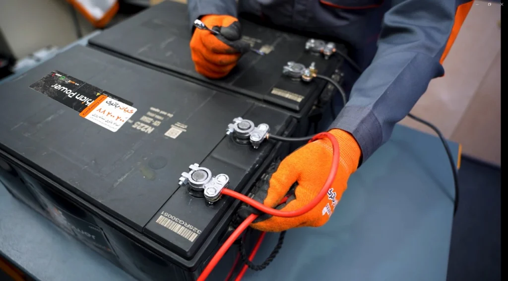 - اتصال کابلها: ابتدا کابل قرمز (مثبت) را به ترمینال مثبت و سپس کابل سیاه (منفی) را به ترمینال منفی متصل کنید و دوباره قطبیت را چک نمایید.