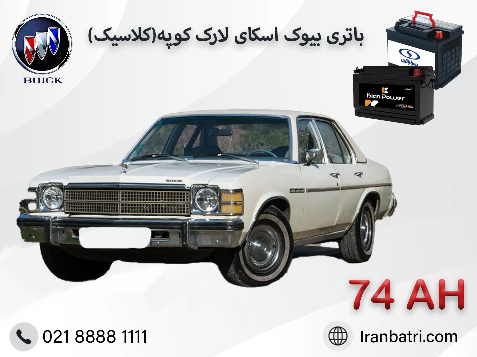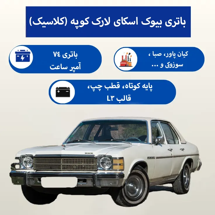 بیوک اسکای لارک کوپه یک خودروی کلاسیک با اصالت و ارزشمند است. انتخاب باتری مناسب با مشخصات ۷۴ آمپر، قالب L3، قطب چپ و پایه کوتاه تضمینکننده روشن شدن مطمئن و سلامت سیستم الکتریکی آن خواهد بود. کارشناسان ایران باتری با سالها تجربه در زمینه تأمین باتری انواع خودروهای کلاسیک و مدرن، آمادهاند تا شما را در انتخاب بهترین گزینه یاری کرده و خدمات مشاوره تخصصی، فروش با گارانتی معتبر و نصب شبانه روزی در محل را برای شما فراهم آورند.