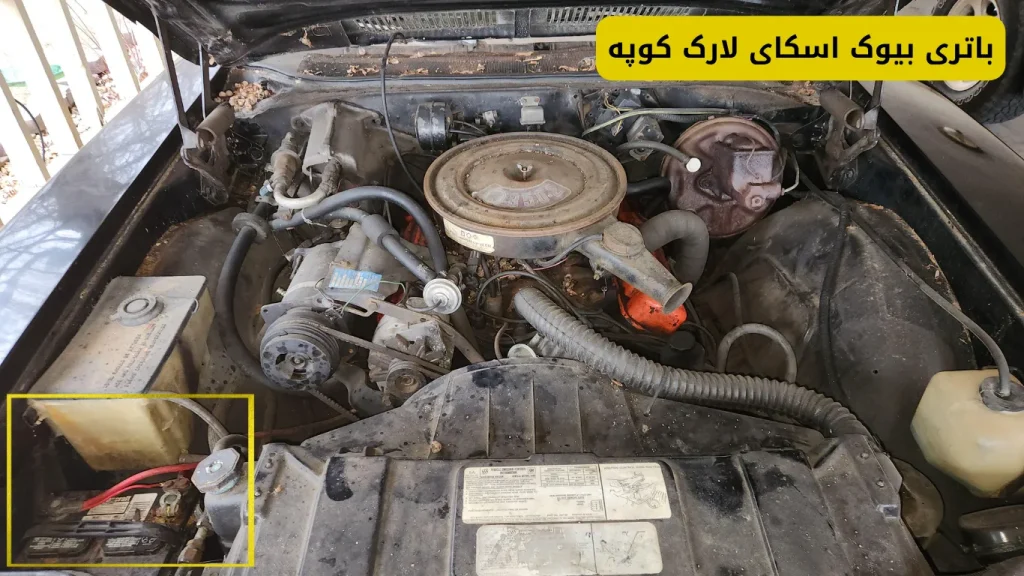 باتری خودرو بیوک اسکای لارک کوپه (خودروی کلاسیک) در قسمت محفظه موتور این خودرو قرار دارد. در تصویر زیر میتوانید محل نصب و قرارگیری باتری این خودرو را مشاهده نمایید: