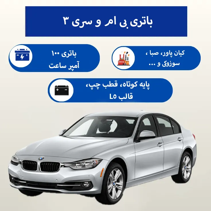 باتری فابریک بی ام و سری 3 دارای ظرفیت 80 آمپر با قالب L4 و چینش قطب چپ است. در صورت نیاز به قدرت بیشتر، باتری 100 آمپر با قالب L5 میتواند گزینهای ارتقایافته و مناسب باشد، به شرط بررسی فضای نصب.