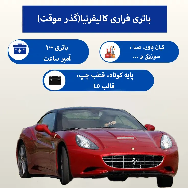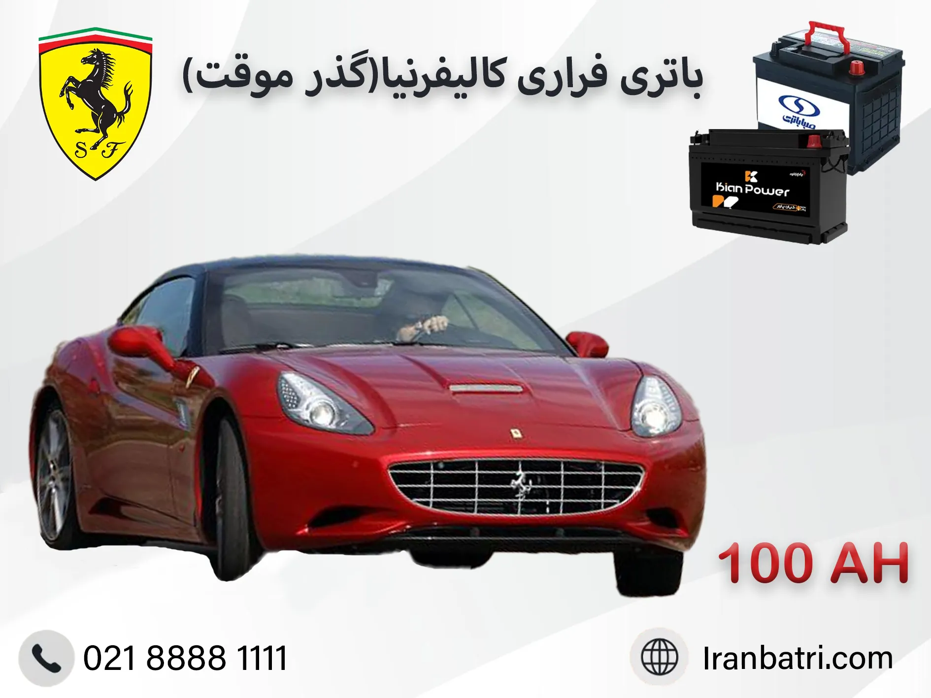 ایران باتری، متخصص در باتریهای خودروهای لوکس، باتریهای سازگار با فراری کالیفرنیا را با کیفیت بالا عرضه میکند. مزایا: