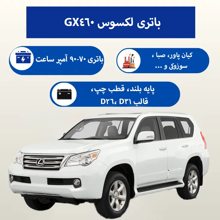 اگر به دنبال بهترین باتری برای لکسوس GX460 هستید، باتری فابریک 70 آمپر پایه بلند با قالب D26 ایدهآلترین گزینه است. در کنار آن، باتری 90 آمپر پایه بلند با قالب D31 نیز بهعنوان گزینه جایگزین اقتصادی قابل استفاده میباشد. خرید از ایران باتری تضمینکننده کیفیت، اصالت و خدمات حرفهای خواهد بود.