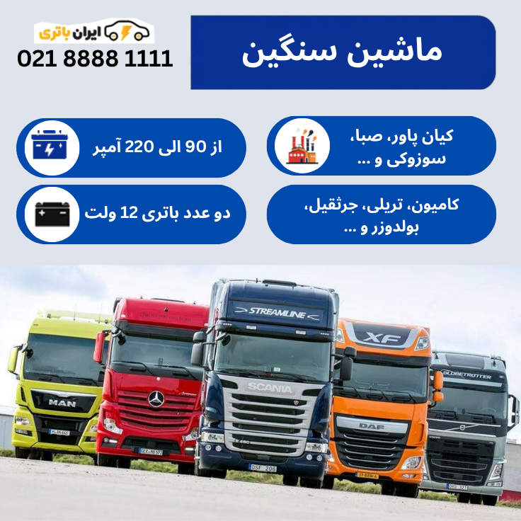 ایران باتری، به‌عنوان یکی از پیشگامان عرضه باتری‌های باکیفیت مانند کیان پاور، صبا، سپاهان، برنا و وایا، راه‌حل‌های قابل اعتمادی برای وسایل نقلیه سنگین مانند کامیون‌ها، اتوبوس‌ها، تراکتورها و ماشین‌آلات صنعتی ارائه می‌دهد. باتری در این خودروها نقشی حیاتی ایفا می‌کند، نه تنها برای استارت موتورهای دیزلی قدرتمند، بلکه برای تأمین انرژی سیستم‌های پیچیده‌ای مانند روشنایی، GPS، پمپ‌های هیدرولیکی و تجهیزات جانبی. انتخاب باتری مناسب، عملکرد بهینه، ایمنی و کاهش هزینه‌های نگهداری را تضمین می‌کند. ایران باتری با خدمات شبانه‌روزی ارسال و نصب باتری، فرآیند خرید را آسان و مطمئن کرده است.