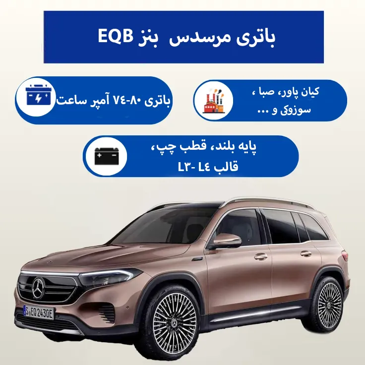 اگر بهدنبال یک باتری مطمئن، استاندارد و بادوام برای مرسدس بنز EQB هستید، باتری 80 آمپر قالب L4 و 74 آمپر با قالب L3 بهترین انتخاب است. با خرید از ایران باتری علاوه بر قیمت مناسب، از خدماتی مانند ارسال سریع، نصب در محل و گارانتی معتبر نیز بهرهمند خواهید شد.