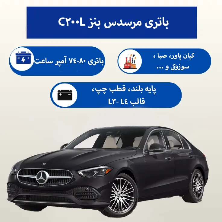 اگر بهدنبال یک باتری مطمئن، استاندارد و بادوام برای مرسدس بنز C200L هستید، باتری 80 آمپر قالب L4 و 74 آمپر با قالب L3 بهترین انتخاب است. با خرید از ایران باتری علاوه بر قیمت مناسب، از خدماتی مانند ارسال سریع، نصب در محل و گارانتی معتبر نیز بهرهمند خواهید شد.