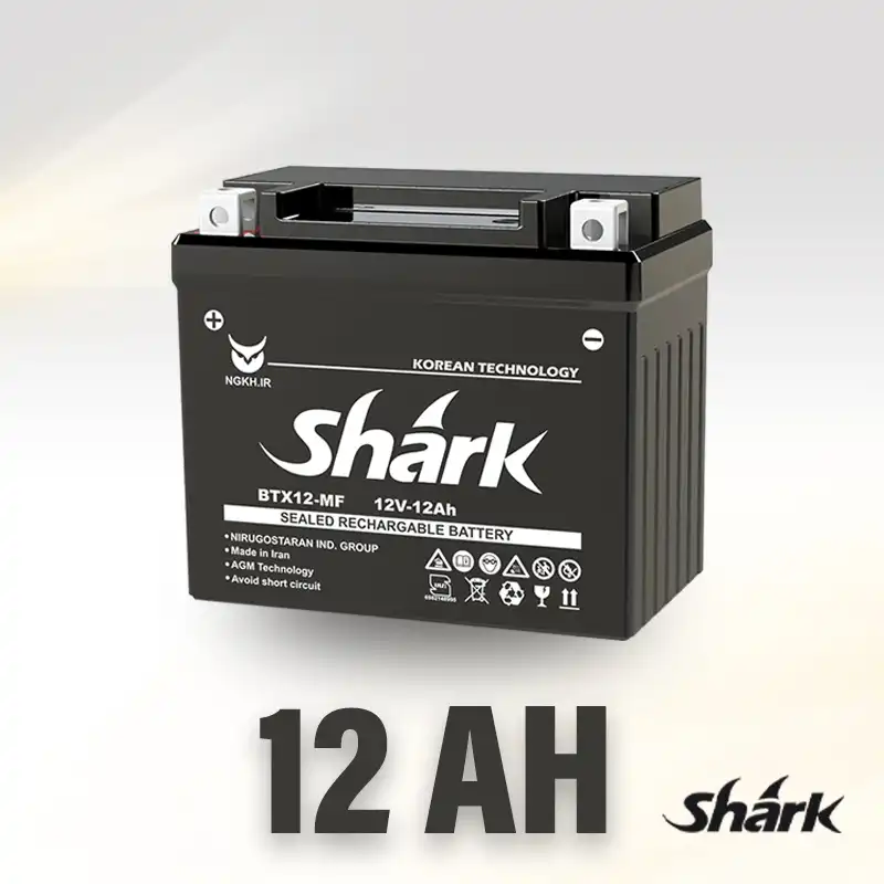 باتری 12 آمپر شارک محصول شرکت نیرو گستران خراسان است که با فناوری AGM تولید میشود. این باتری برای موتورسیکلتهای با مصرف برق بالا و حجم موتور متوسط تا سنگین مناسب است.